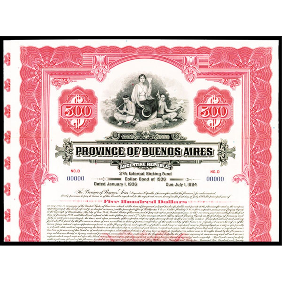 Argentina, 1936, $500, 3% External Sinking Fund Dollar Bond of 1936, Specimen bond, Allegorical reaper with scythe and young men, Black on Red border and underprint, POC's, XF, ABNC.