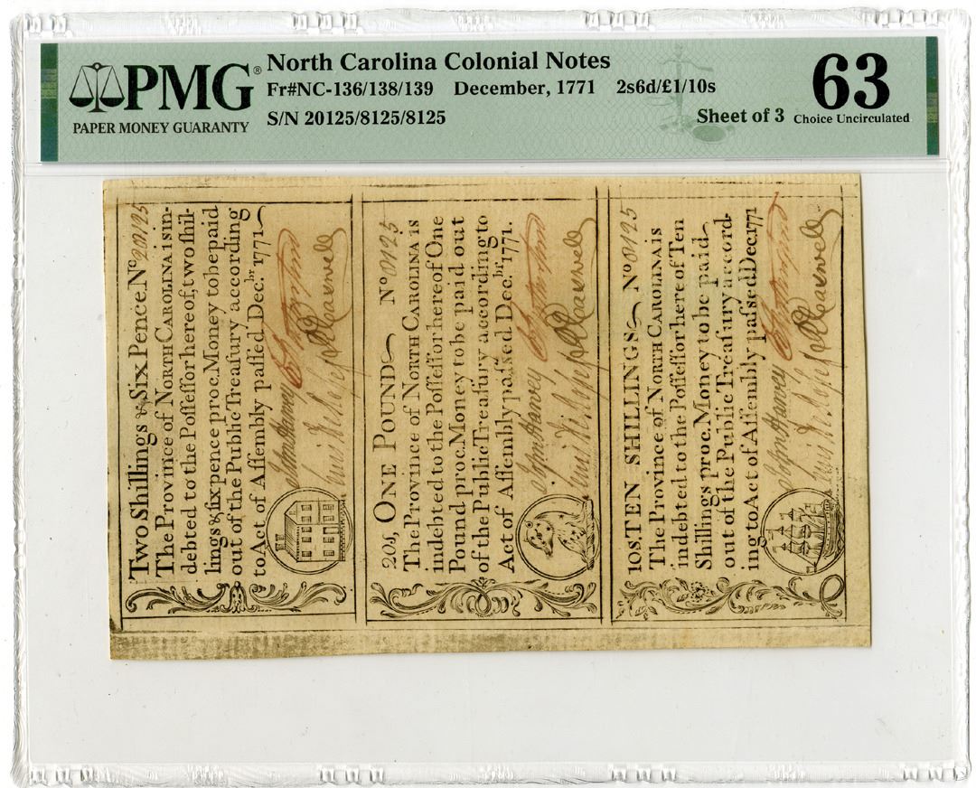 North Carolina, December, 1771, Uncut Sheet of 3 notes, 2s6d / £1 / 10s. Fr#NC-136/138/139, Issued banknotes, Black on off white paper, S/Ns (20125 / 8125 / 8125?), PMG graded Choice Uncirculated 63.