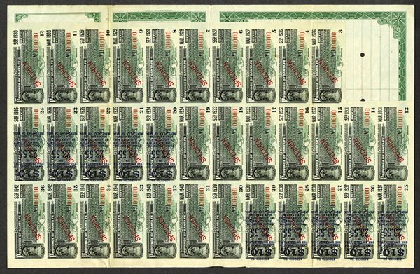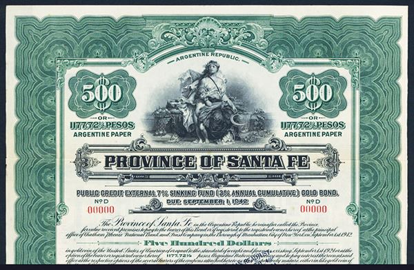 Santa Fe, Argentina. 1924 (1934), $500 or 1177.72 1/2 pesos Argentine Paper, 7% public credit external sinking fund gold bond. ABNCo, EF, Legend overprinted in middle lowering the interest rate and altering the terms of payment of the bond right after the U.S. went off the gold standard and payment to be Paid in Dollars instead of gold". Rare transition from gold standard effecting international dollar denominated bonds. "