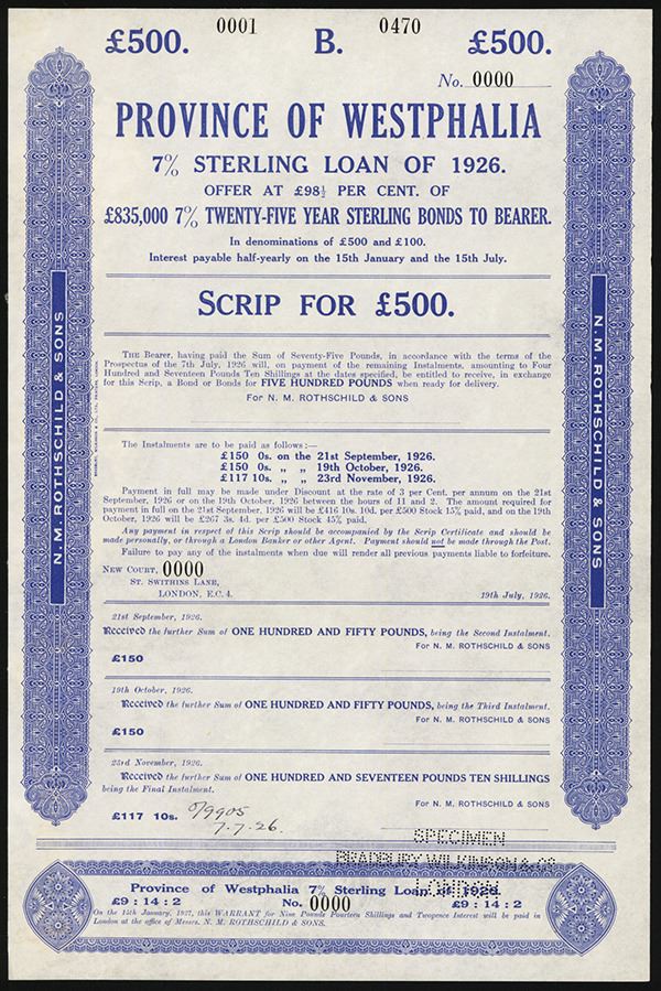 Germany, 1926, 500 Sterling, 7% Sterling Loan, Specimen Bond, Blue print with ornate borders no vignette, VF-XF condition, Bradbury, Wilkinson & Co.