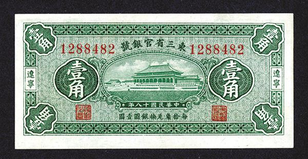 China. 10 Cents. P-S2959a. S/M T214-181a. Mukden. Bold embossing. Very Choice Uncirculated.
