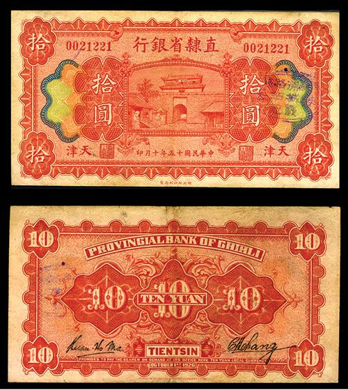 Tientsin, China, 1926, $10, P-S1290a (S/M #C163-82a), Issued banknote, red on m/c, building in middle, back red, S/N 0021221, PMG graded Choice Very Fine 35 with claims to an XF designation, The second highest graded out of 3 in the PMG census.