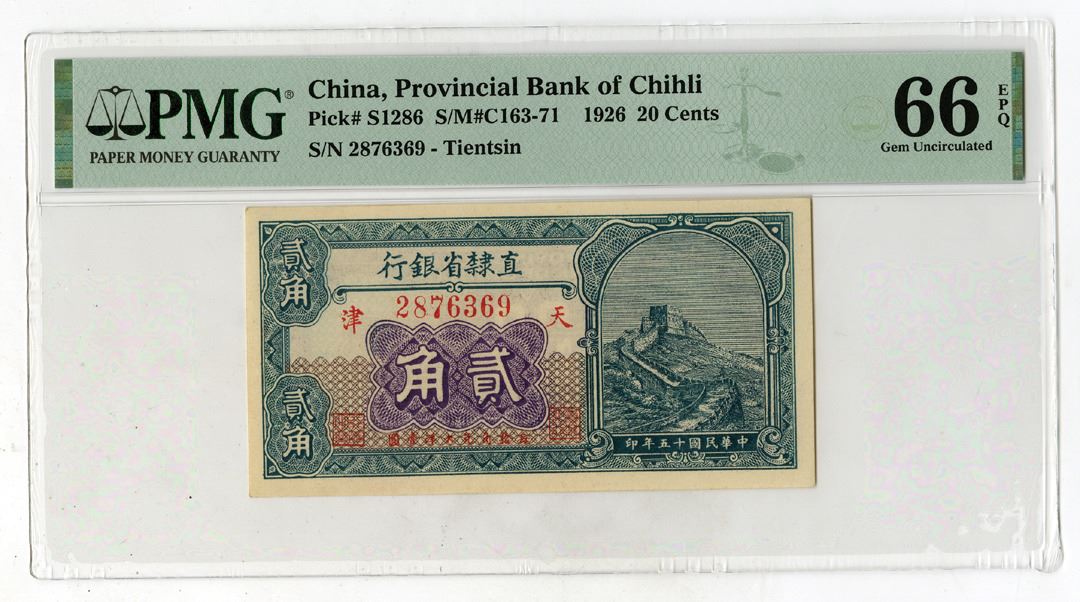 China, 1926. 20 Cents, P-S1286, S/M#C163-71, "Tientsin" Branch Issued Banknote, Blue-green on brown and violet underprint with great wall at right, Back is purple on green, S/N 2876369, PMG graded Gem Uncirculated 66, EPQ. Attractive note rarely seen this nice.