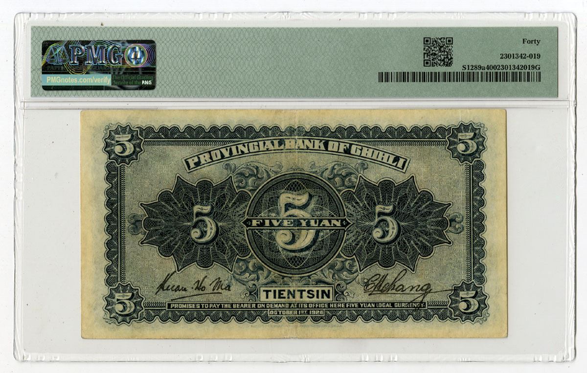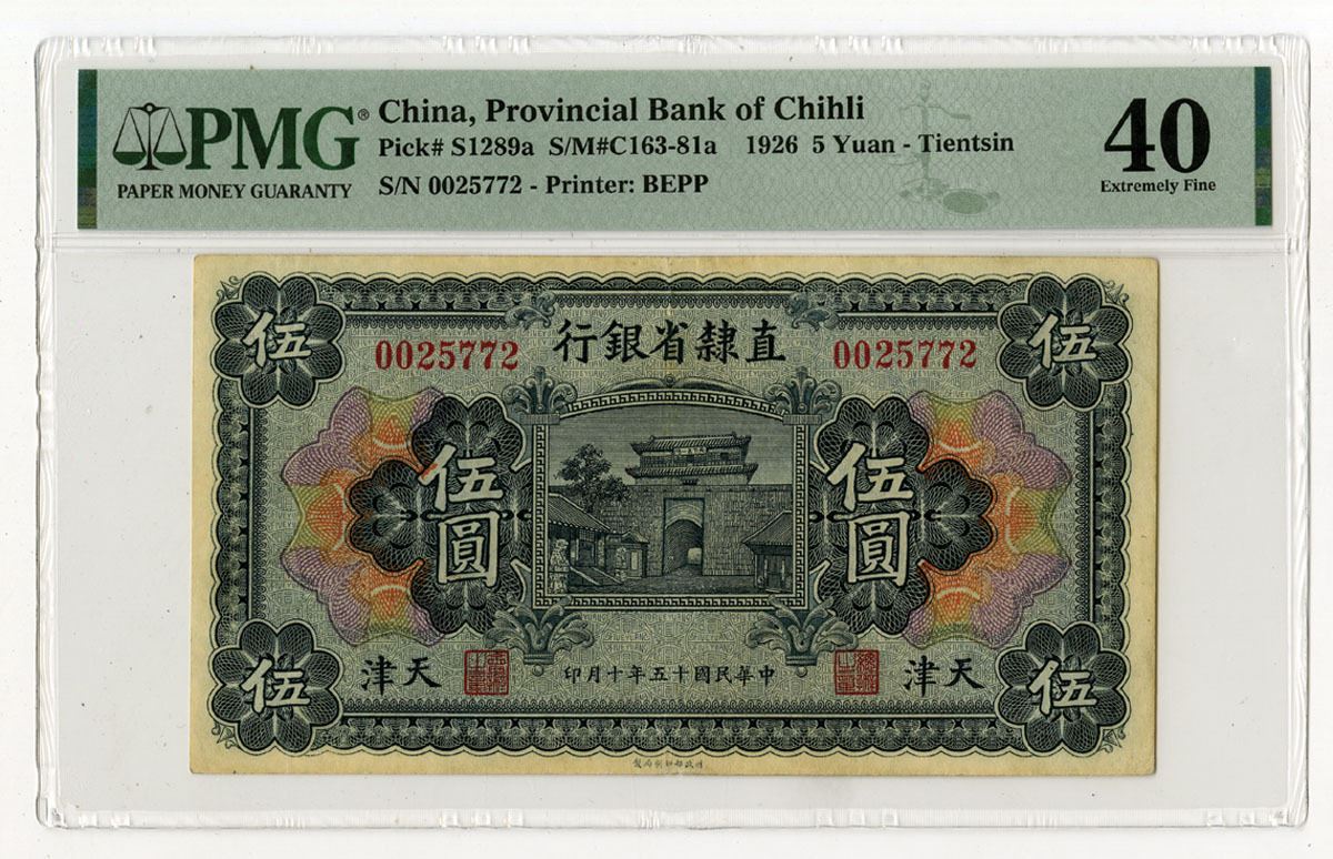 Tientsin, China, 1926. 5 Yuan, P-S1289a, S/M#C163-81a, Issued Banknote, Blue on m/c underprint with city gateway at center, Back is blue with bank name at top and denomination at center, S/N 0025772, PMG graded Extremely Fine 40, BEPP.