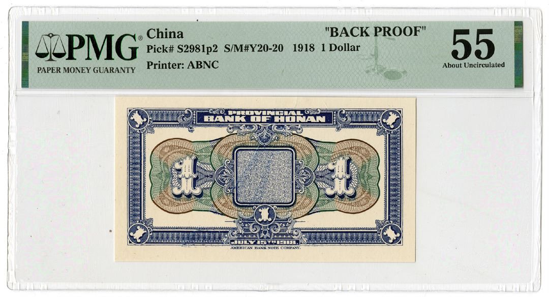 China, 1918. $1, P-S2981p2, S/M#Y20-20, Back proof, Blue on m/c underprint with bank title at top, PMG graded About Uncirculated 55 , ABNC.