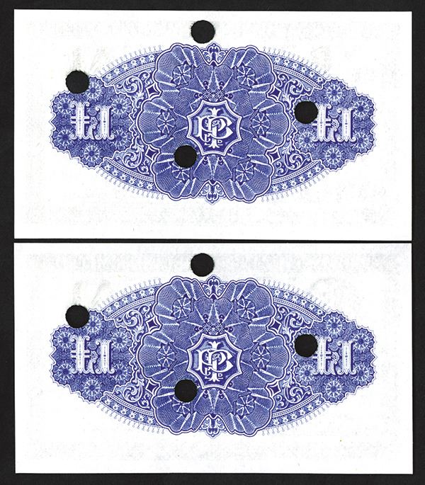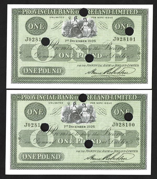Northern Ireland, pair of 1 Pound notes, consecutive serial number J028100 and J028101, hole-punch cancelled, Choice to Gem Uncirculated. Rare.