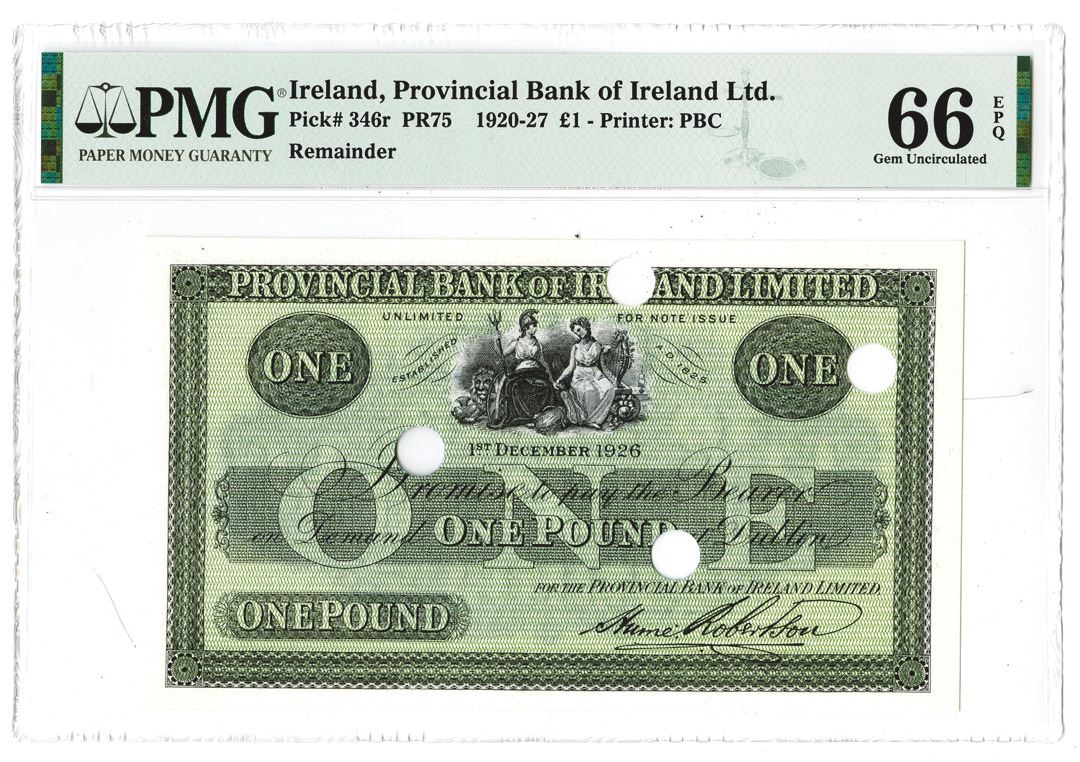 Ireland, 1st December, 1926, £1 Pound, P-346r, PR75, Black on light green underprint, Arms top middle back blue, 4 large POC's, PMG graded Gem Uncirculated 66 EPQ, PBC. Only 6 graded notes in the PMG census.