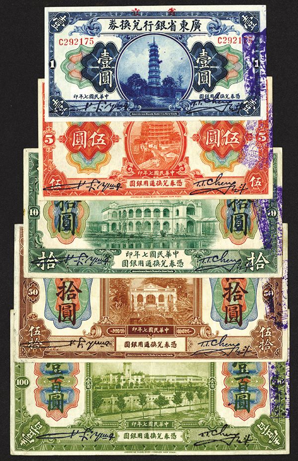 China, Lot of 5 notes, All are 1918 issues, includes $1 to $1000, P-S2401; P-S2402; P-S2403; P-S2404; P-S2405; Choice VF to AU, All with blue overprint on right, all with English signatures, Attractive assortment. ABNC.