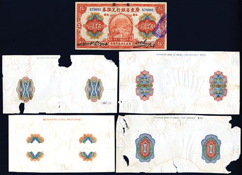 Lot of 5 items, includes 1918, $5, P-S2402b (S/M#K55-21b), Issued in VF with its corresponding undertint of the m/c guilloches on the left and right. The undertint is printed on india paper in the issued colors. Also included without the corresponding notes are the $10; $50 and $100 undertint production proofs in issued colors. Condition of the proofs vary between VF with pieces missing from margins where evidently they were removed from a book to AU. Rare banknote production material from ABN Archives. ABNC.