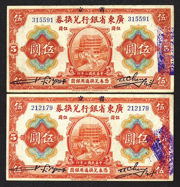 China, Republic. 5 Dollars. P-S2402b. Building at center. Orange. ABNC. Both with hand stamps. Fine. 2 pieces.