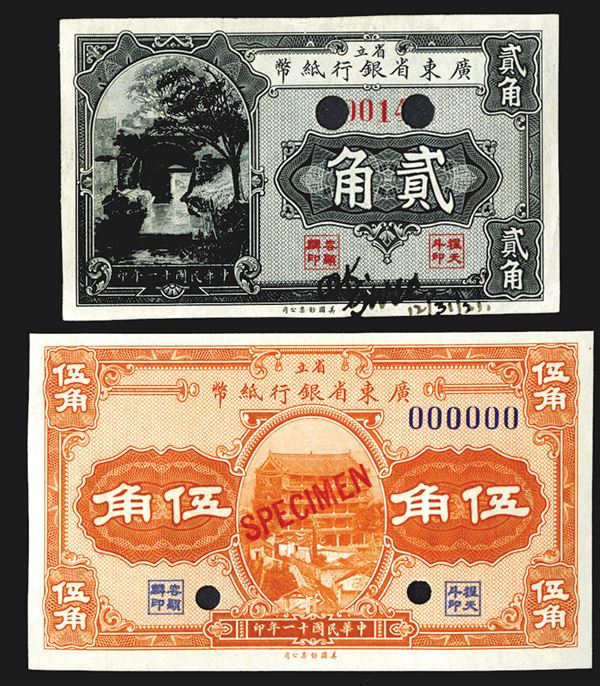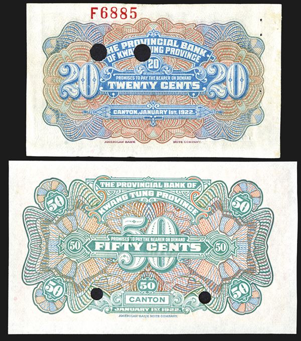 Canton, China. 20 cents, P-S2407s, AU condition with archival approval signatures on the lower margin and 2 staple holes on the upper left corner and 50 cents, P-S2408s, Choice to Gem Uncirculated, Specimen banknotes. Red specimen overprint, “00000” serial number and POC's. Choice to Gem Uncirculated condition. ABNC.