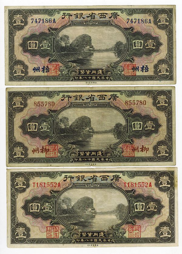 China, Lot of 3 notes, All Are $1, P-S2339 varieties from different locations, Includes P-S2325a, issued but no place name, VF; Lungchow, P-S2339c, Choice Fine to VF; and Wuchow, P-S2339g, VF, scarce assortment and tough to find locations. ABNC.