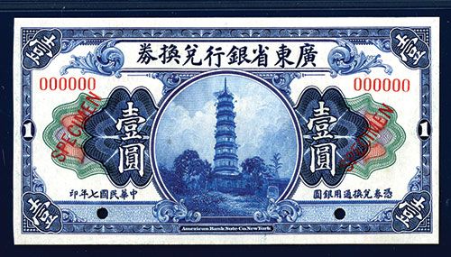 Canton, China, 1918, $1, P-S2401s, (S/M #K55-20), Specimen, Blue on m/c with Pagoda at center, back green, Specimen overprint, POC and S/N 00000, PMG graded Gem Uncirculated 66 EPQ (Exceptional Paper quality), Tied for highest graded out of 7 in the PMG census. ABNC. ABNC.