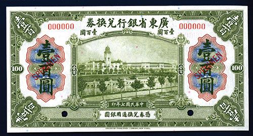 Canton, China, 1918, $100, P-S2405s, (S/M #K55-24), Specimen, Olive green on m/c with Building at center, back navy-blue, Specimen overprint, POC and S/N 00000, Choice to Gem Uncirculated condition with large even margins, bright colors and sharp corners, ABNC.