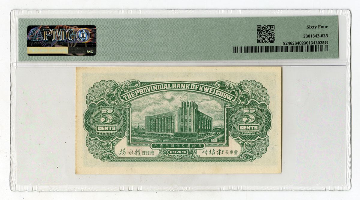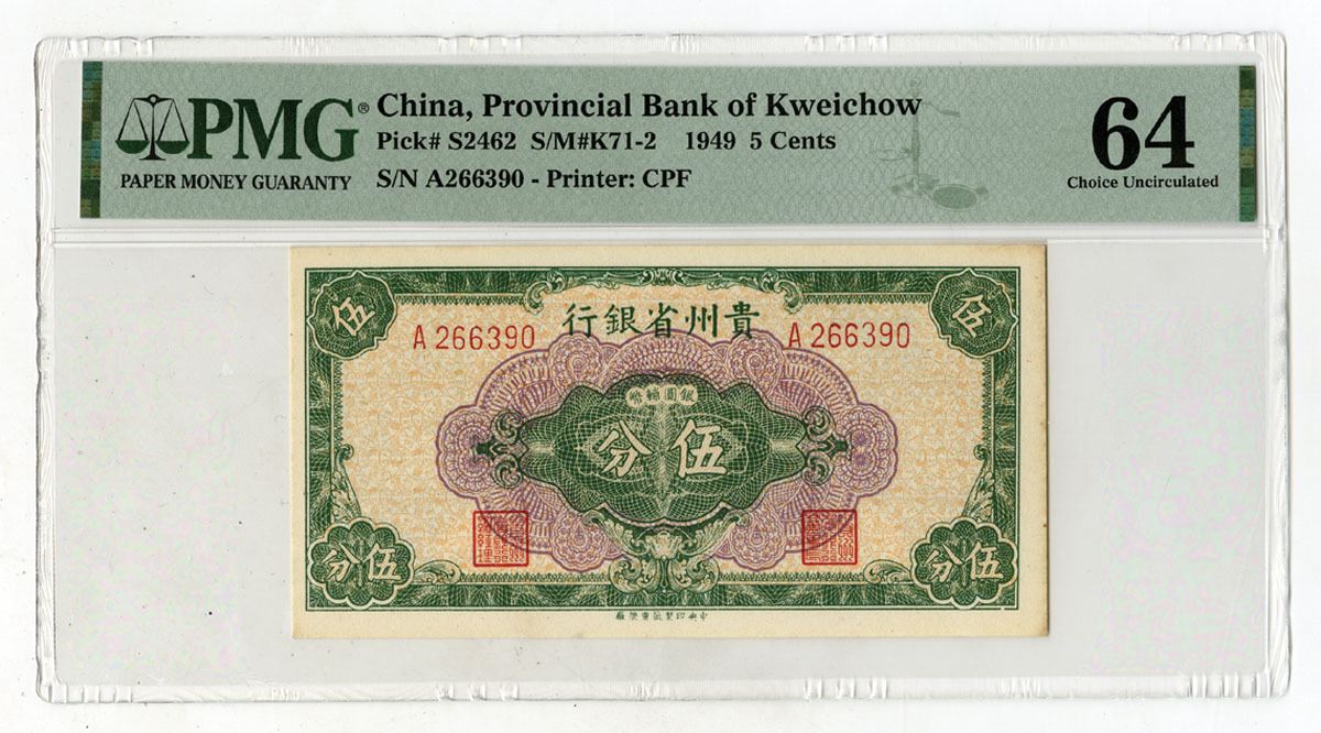 China, 1949. 5 Cents, P-S2462 S/M#K71-2, Issued Banknote, Green on purple and orange underprint, Back is green with modern building at center, S/N A266390, PMG graded Choice Uncirculated 64, CPF.