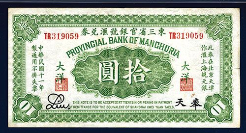 Manchuria, China, $10, P-S2938 (S/M#T214-142), Issued banknote, green face, back blue and black, PMG graded Choice Very Fine 35 NET with note of small rust spots and a small tear on the right middle margin, attractive note with only 4 notes graded by PMG.