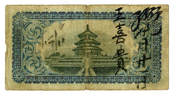 Manchuria, China, $10, P-S2938 (S/M#T214-142), Issued banknote, green face, back blue and black, S/N F0011342, Fine to Choice Fine condition with graffiti on back right, strong vertical middle fold and rough right edge, otherwise an attractive example of this scarce note.