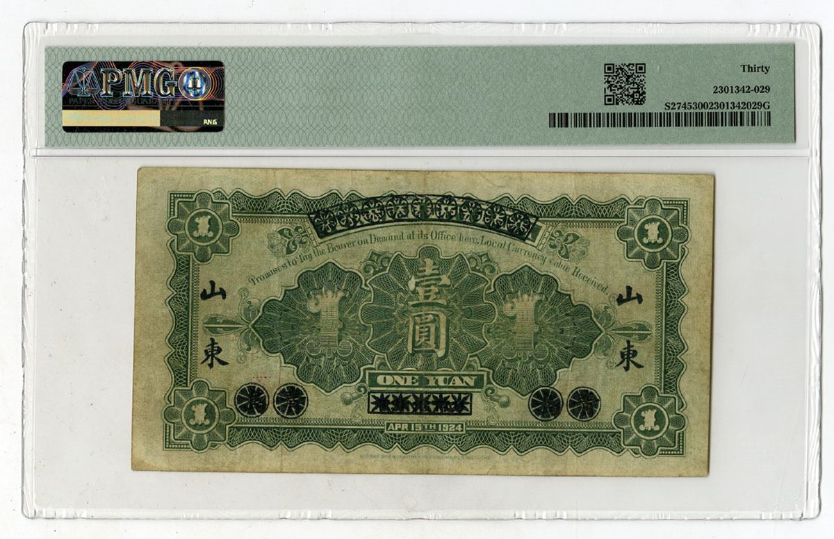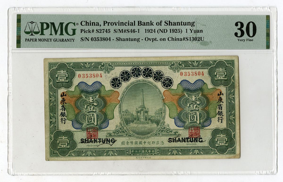 China, 1924 (ND 1925). 1 Yuan, P-S2745 S/M#S46-1, Issued Banknote, Note is an overprint of P-S1302U which has green on m/c underprint with monument at center and a green back, S/N 0353804, PMG graded Very Fine 30, BEPP.