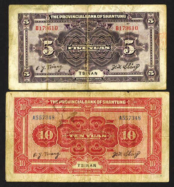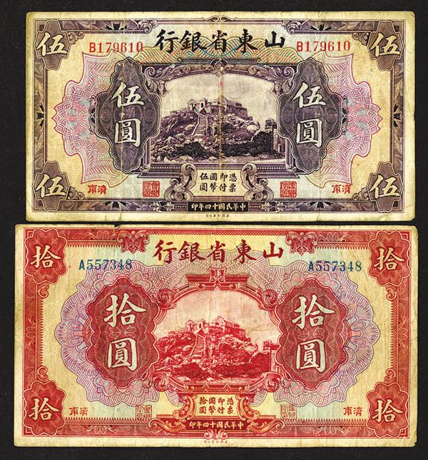 China. 5, 10 Yuan. Tsinan. P-S2758a, S2759. S/M S46-23a, -25. Hilltop house at center of both. Nice Fine, second with black ink graffiti. 2 pieces. (The Silicon Valley Collection)