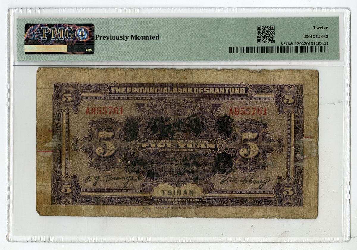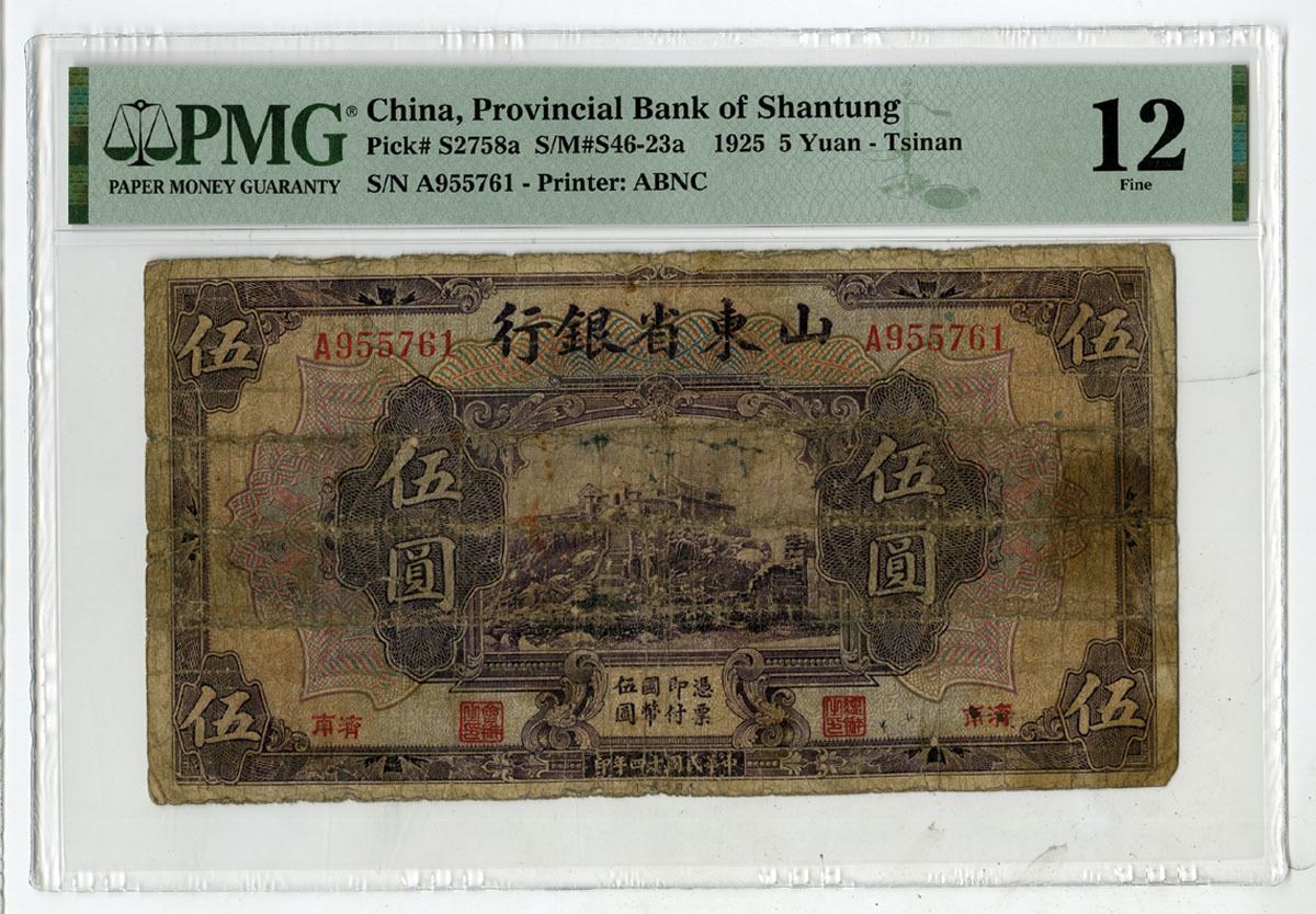 Tsinan, China. 1925. 5 Yuan, P-S2758a S/M#S46-23a, Issued Banknote, Purple on m/c underprint with house on a hill at center, Back is purple, S/N A955761, PMG graded Fine 12 with comment "Previously Mounted," ABNC.