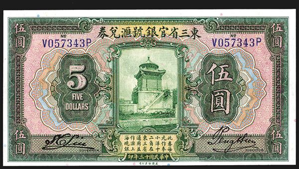 1924. $5. P-S2952a. (S/M #T214-173a) Issued banknote. Tower on green and m/c on face, back is orange. Uncirculated to CU condition. ABNC. Scarce note.