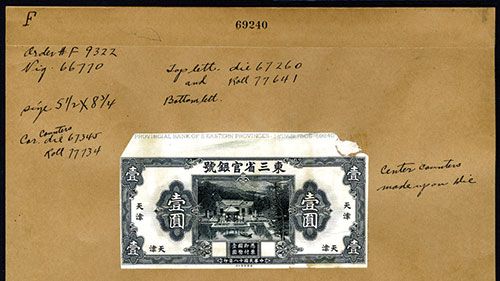 China, 1 Yuan, P S2962 (S/M#T214-190-), Proof printed in black on india paper mounted on large manila file card, archival text and notations written on card away from banknote, Large excess margin on top of proof, Uncirculated with light toning on lower right margin and a small tear on top right excess paper just touCh’ing design, Black without underprint. ABNC.