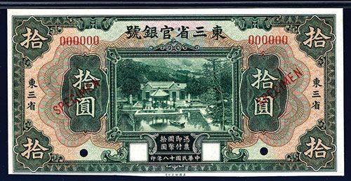 Three Eastern Province, 1929, 10 Yuan, P-S2964s1 (S/M#T214-192a) Specimen, Green on m/c, Pavilion by pool at center, Red specimen overprints, “00000” serial number and POC's, back green. PMG graded Choice Uncirculated 63 EPQ (Exceptional Paper Quality). ABNC.