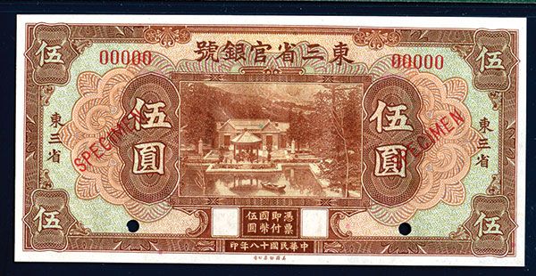 Three Eastern Province, 1929, 5 Yuan, P-S2963s1. Specimen, Brown on m/c, Pavilion by pool at center, Red specimen overprints, Ò00000Ó serial number and POC's, back brown. PMG graded Gem Uncirculated 66 EPQ (Exceptional Paper Quality). This note will be almost impossible to improve upon with 5 graded at this level with none higher. ABNC. Rare banknote in high grade.