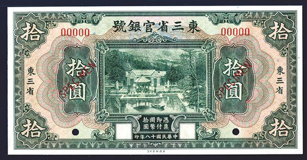 China. Three Eastern Provinces, China, 1929, 10 Yuan, P-S2964s1, "Three Eastern Provinces" place name, (S/M #T214-192a), Specimen Banknote, green and m/c with house on pond, back green, POC's. PMG graded Superb Gem Uncirculated 67 EPQ. ABNC. One of the finest known and this example will be difficult to improve upon.
