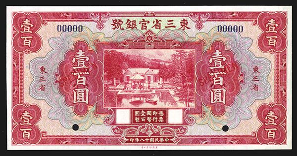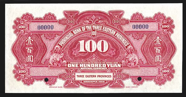 Three Eastern Provinces, China. 1929, 100 Yuan, P-S2965s S/M#T214-193, Specimen banknote. Red on m/c, PMG graded Choice About Uncirculated 58 EPQ. ABNC. Rare banknote.