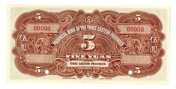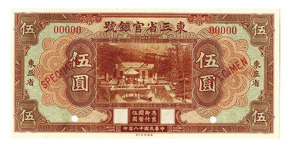Three Eastern Province, China. 1929, 5 Yuan, P-S2963s1. Specimen, Brown on m/c, Pavilion by pool at center, Red specimen overprints, “00000” serial number and POC's, back brown. Choice to Gem Uncirculated condition. ABNC. Rare banknote in high grade.