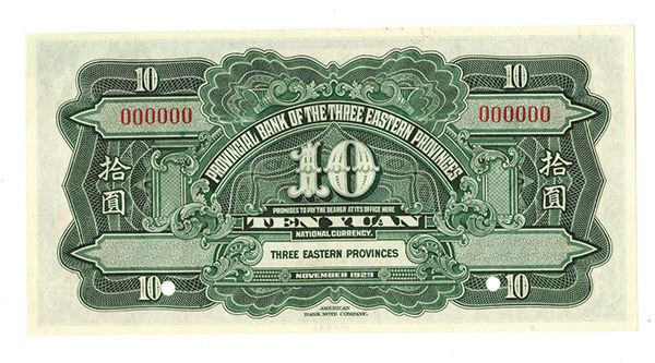 Three Eastern Province, China. 1929, 10 Yuan, P-S2964s1 (S/M#T214-192a) Specimen, Green on m/c, Pavilion by pool at center, Red specimen overprints, “00000” serial number and POC's, back green. Gem Uncirculated. ABNC.