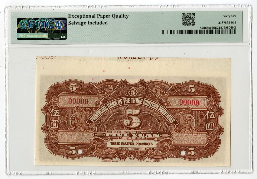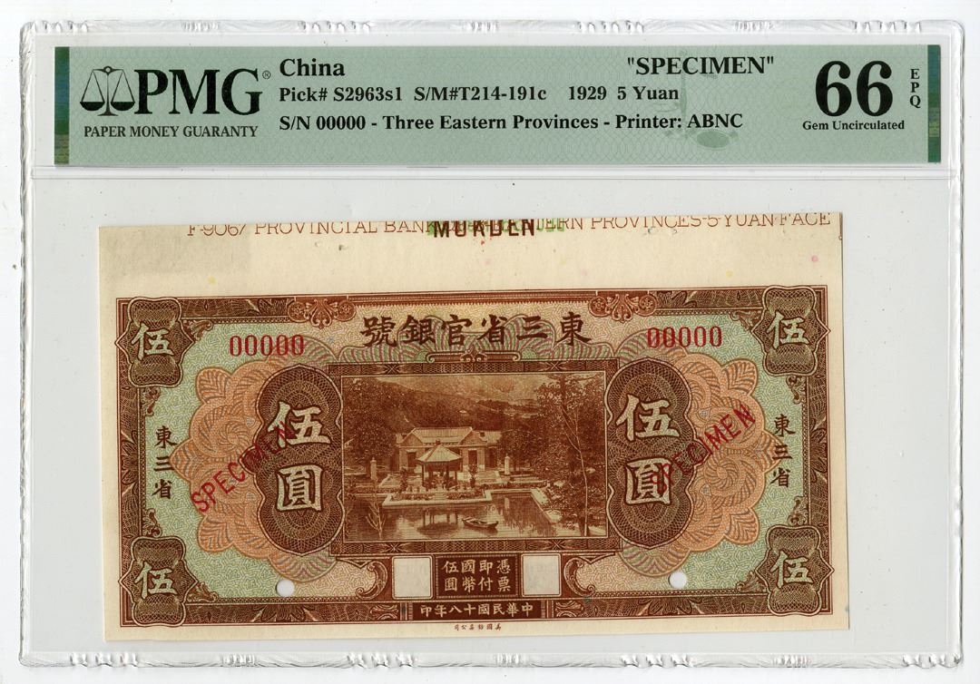 China, 1929. 5 Yuan, P-S2963s1 S/M#T214-191c, Specimen Banknote, Red-brown on m/c underprint with home and river front at center, Specimen overprints and POCs, S/N 00000, PMG graded Gem Uncirculated 66 EPQ with comment "Selvage Included," ABNC.