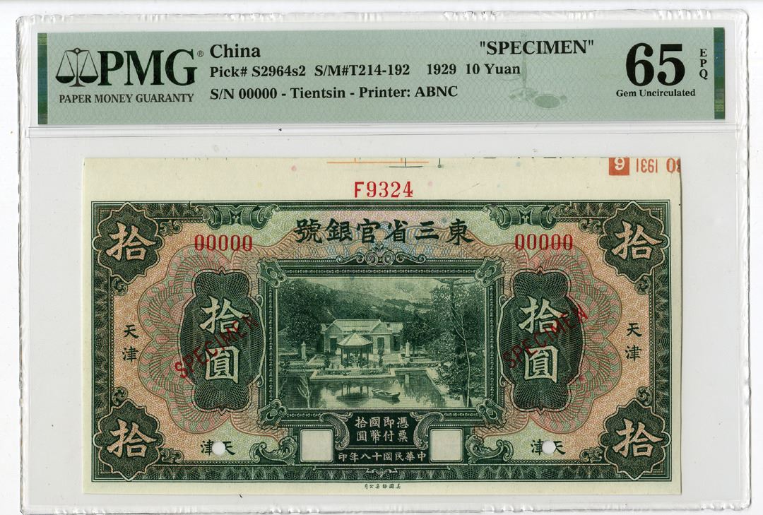 China, 1929. 10 Yuan, P-S2964s2 S/M#T214-192, Specimen Banknote, Green on m/c underprint with home and river front at center, Specimen overprint and POCs, S/N 000000, PMG graded Choice Gem Uncirculated 65 EPQ with comment "Selvage Included," ABNC.