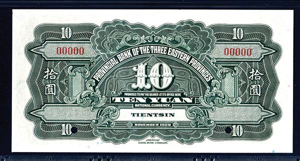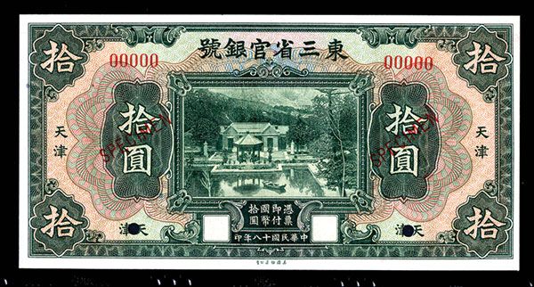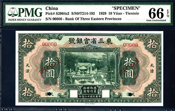 Tientsin, China, 1929, 10 Yuan, P-S2964s2 (S/M #T214-192), Specimen banknote, Green on m/c, house in middle with canoe, back green, POC's, PMG graded Gem Uncirculated 66 EPQ (Exceptional Paper Quality)", Rare note that was not know to exist before the June 1991 Christie's auction of the American Bank Note Archives. ABNC. Tied for Finest graded out of 11 graded in the PMG census. ABNC.