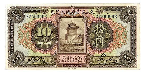 China. Issued 10 Dollars, P-S2953, S/M#T214-175, Tower at center, nice Very Fine.