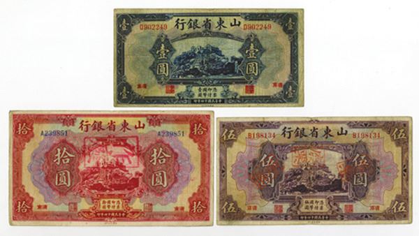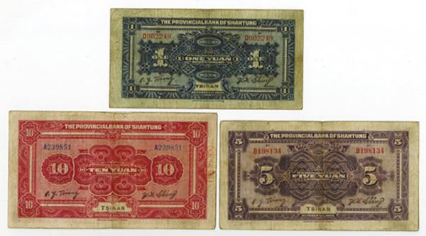 Tsinan, China, Lot of 3 notes, Includes 1 Yuan; 5 Yuan and 10 Yuan notes, All are VF to Choice VF. The 5 and 10 Yuan have red Chinese overprints on face. Attractive and scarce. ABNC. (Ex-Alexander I. Pogrebetsky Family Archives).