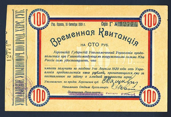 Territory of Khereson, Russia. Plenipotentiary for Food of the Government, Odessa Provisional Receipt, P-S378, 100 Roubles, blue and red on brown paper, Uncirculated.