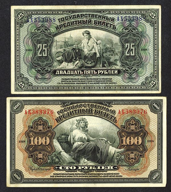 Russia - East Siberia. 25, 100 Rubles. P-S1196, S1197. Female seated at center of each. Nice and colorful. Bold overprints on back. Fine-Very Fine. 2 pieces. (The Pogrebetsky Family Archives)