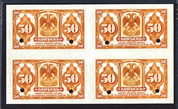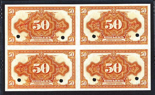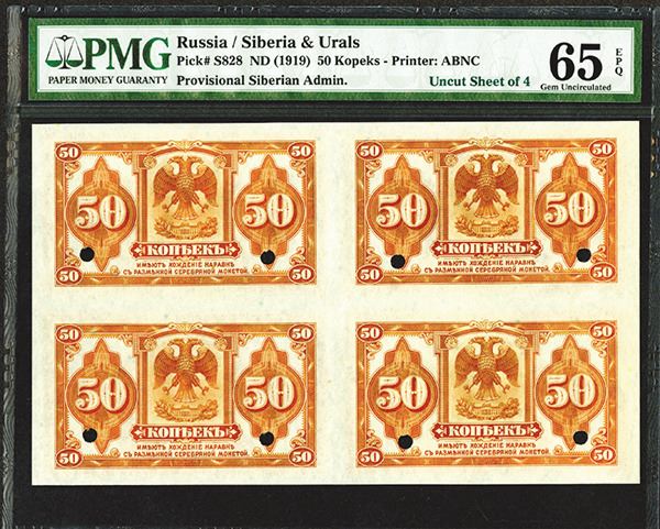 Russia - Siberia & Urals. 50 Kopeks. P-S828 but unlisted in this form. ABNC Specimen overprints with POCs. Uncut sheet of 4. PMG Graded Gem Uncirculated 65 EPQ.