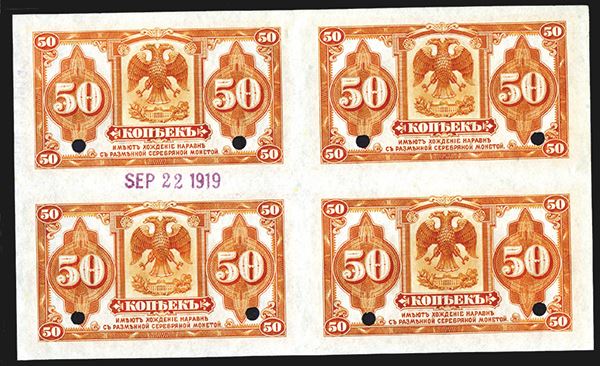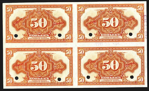 Russia, 1919, 50 Kopeks (4 examples in 1 block), P-S828s, Orange on front an back, overprinted Specimen in red with 2 POC's on each note, Purple hand stamps on right front border and back middle gutter border with archival date stamp Sep 22 1919, PMG graded Gem Uncirculated 66 EPQ. Rare as specimen and possibly the first time seen as an uncut block of 4 notes. ABNC. Only 4 single notes and this block of 4 graded by PMG with this block tied with the finest known. Amazing showpiece.