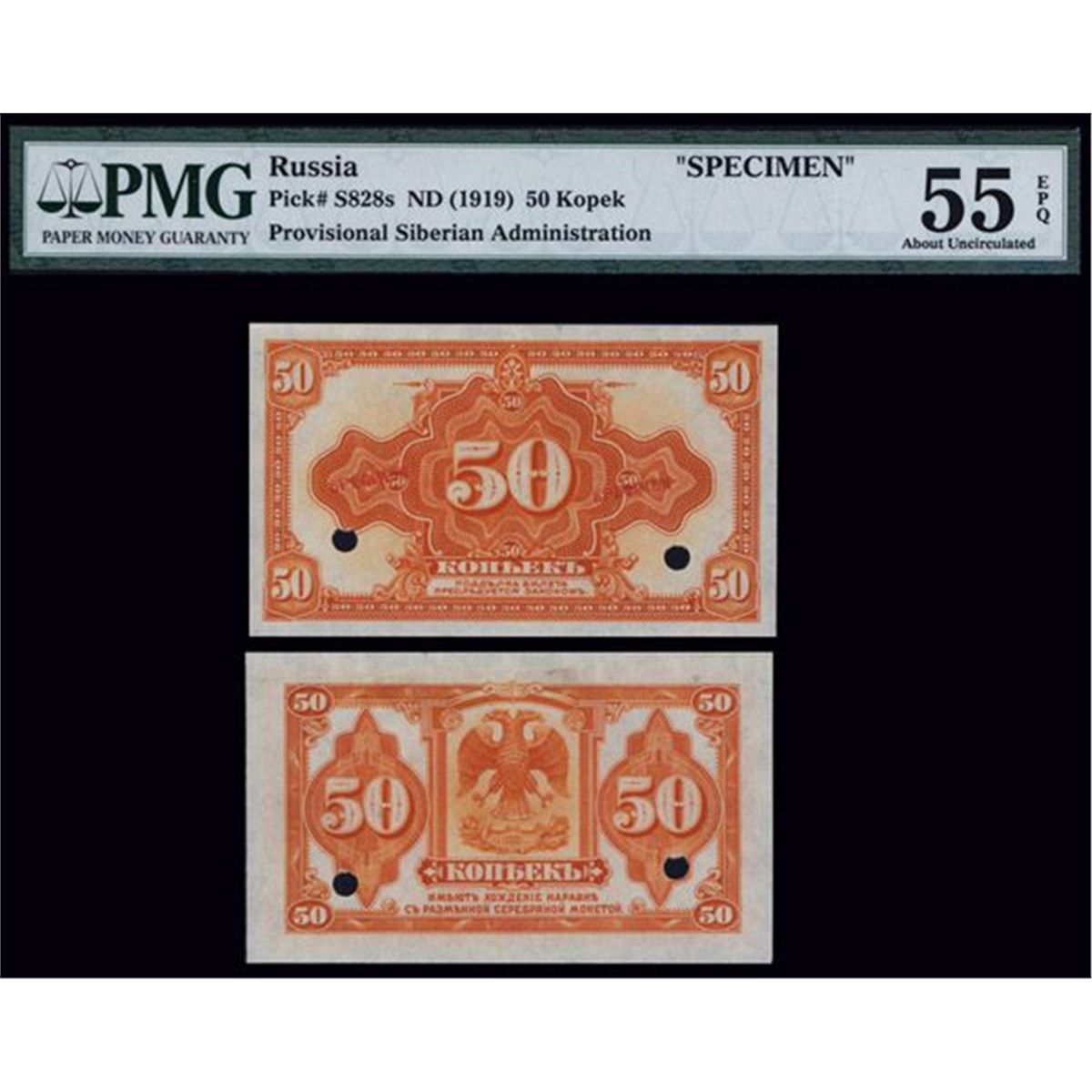 Siberia & Urals, Russia, ND (1919). 50 Kopecks, P-S828s, Unlisted specimen. Orange with no underprint, Punched out cancels and small red “Specimen” overprints. No signatures, PMG Graded “SPECIMEN” About Uncirculated 55 EPQ (Exceptional Paper Quality), 4 large even margins and bright colors. Rare and attractive banknote. ABNC.