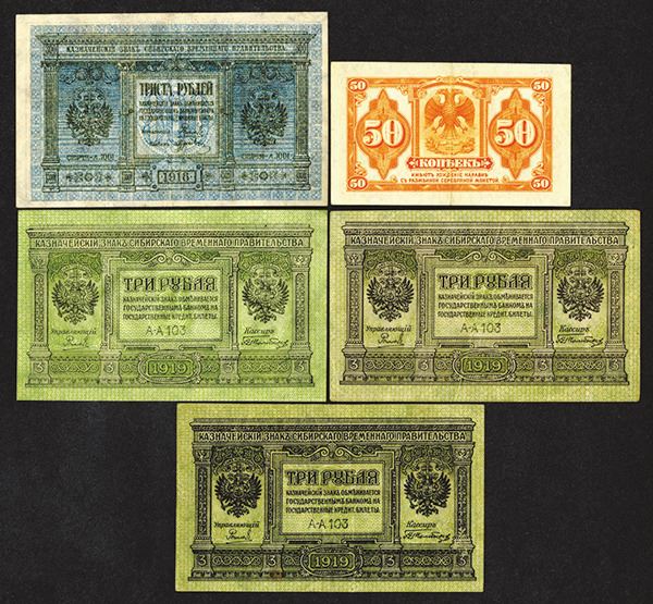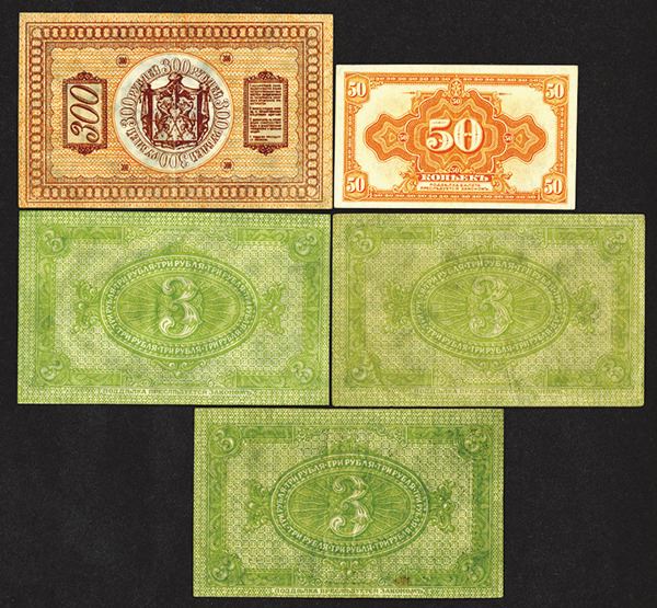 Russia - Siberia & Urals. 300, 3 Rubles, 50 Kopeks. P-S826, S827 (3), S828. Very Fine. 5 pieces. (The Silicon Valley Collection)