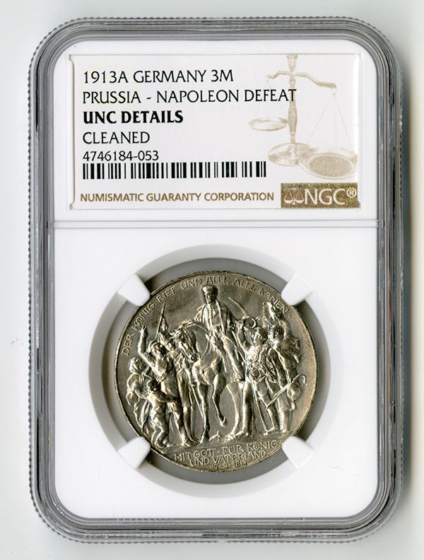 Prussia, Germany. 3 Marks, 1913A, KM-524, Napoleon Defeat Commemorative, NGC graded UNC Details with comment "Cleaned".