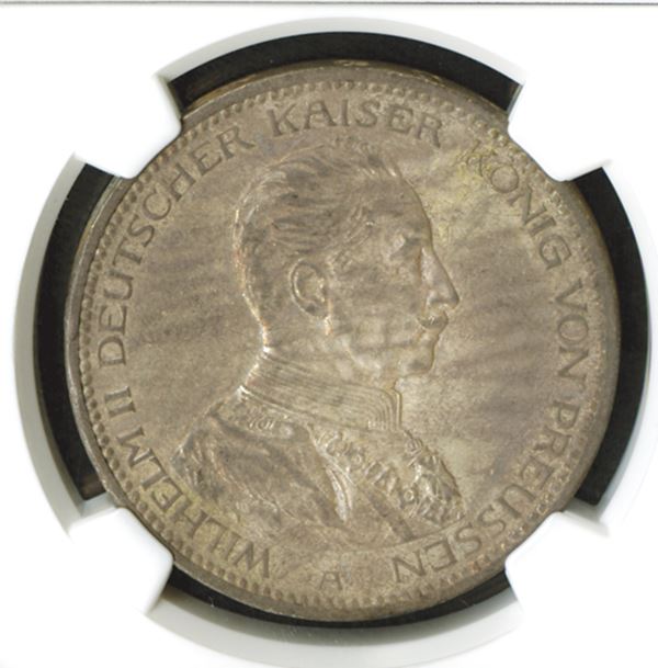 Germany. Prussia. Wilhelm II 5 Mark, 1914A. KM-536. Even grey tone, streaky on the obverse. NGC MS 62.