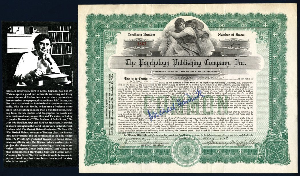 Delaware. 1928, 5 Shares I/U Stock, #1867, Black print with green border and underprint, Allegorical woman top center, VF condition certificate with crisp looking signature in blue, Goes 79. Signature of Michael Hardwick in center, a British freelance writer who is best known for "The Sherlock Holmes Companion, The Man Who Was Sherlock Holmes".