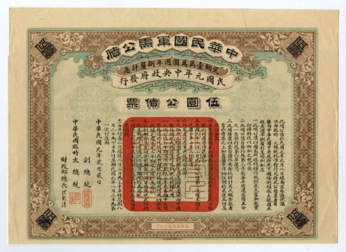China, 1912. 5 Dollars 8% I/U Coupon Bond, Black print with brown border and blue-green underprint, Face is printed in Chinese and back is printed in English, S/N 059556, The bond was authorized by the Provisional Government under a Resolution of the Assembly of Provincial Delegates at Nanking, dated January 8, 1912. Bond is in VF to XF condition, Commercial Press.