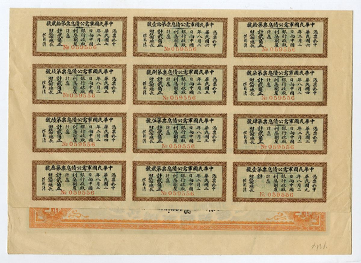 China, 1912. 5 Dollars 8% I/U Coupon Bond, Black print with brown border and blue-green underprint, Face is printed in Chinese and back is printed in English, S/N 059556, The bond was authorized by the Provisional Government under a Resolution of the Assembly of Provincial Delegates at Nanking, dated January 8, 1912. Bond is in VF to XF condition, Commercial Press.