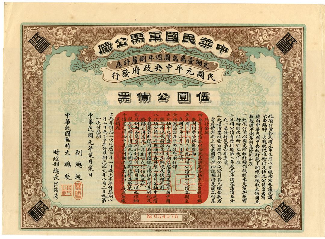China, First Year of the Republic, 1912, $5 I/U bond, Coupons attached, Black text on blue and light blue underprint with light brown ornate border with large red seal in middle, back in English, XF condition. Scarce Military bond. Rare.