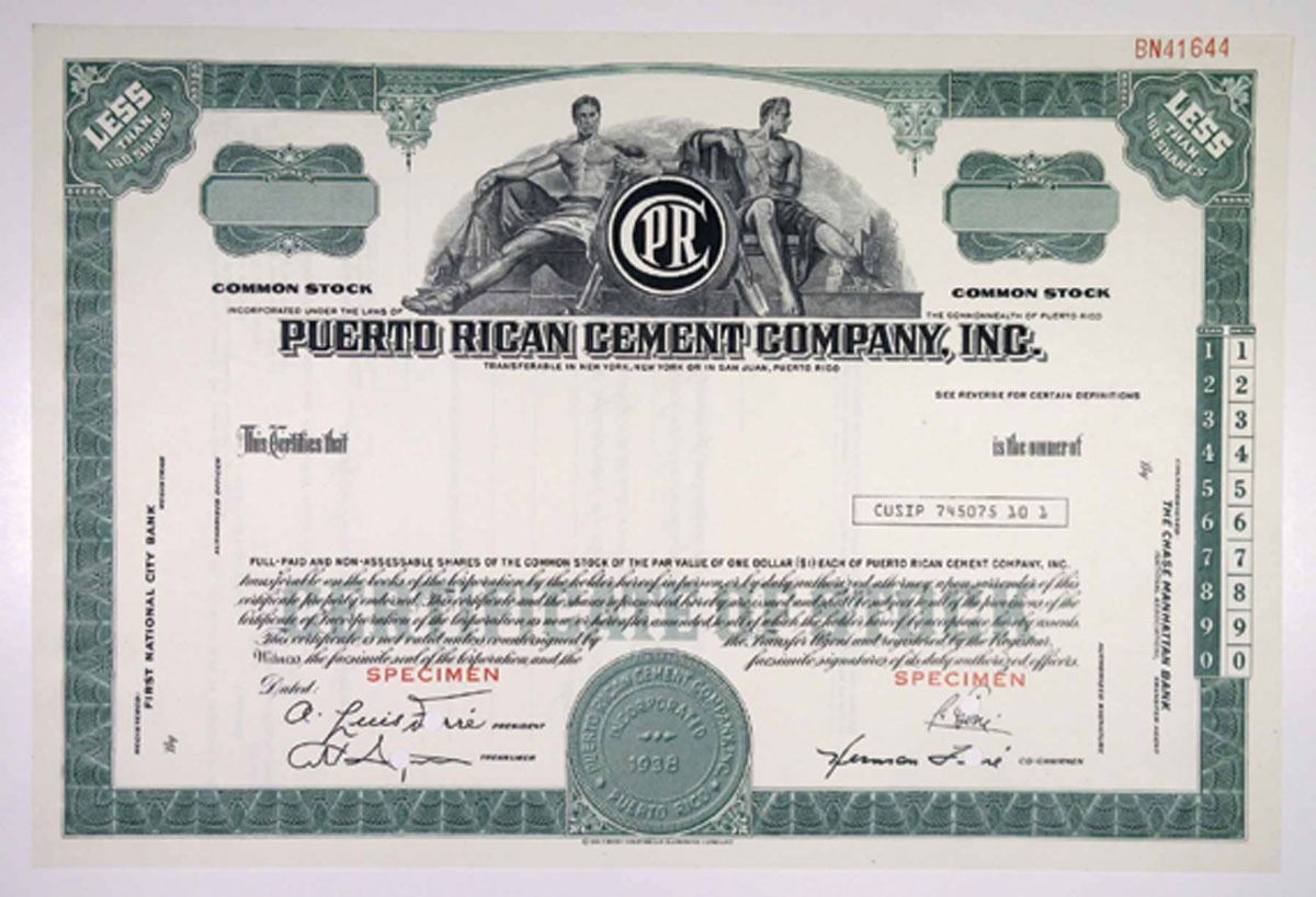 Puerto Rican Cement Co., Inc., 1970s Specimen Stock Certificate, VF SCBN. Prior to its acquisition by Empresas Ferre, Puerto Rican Cement Company was owned by the Government of Puerto Rico. The company is now a part of Ponce Cement, Inc.